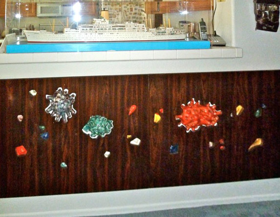 Ich bin mir nicht ganz sicher, welches Kunstwerk ich am liebsten mag. Ich habe ein Gemälde von Kleopatras Selbstmord von Majoli aus dem Restaurant der Ausonia, ein geschnitztes Holzpanel aus dem Hauptgang mit der SS Hamburg – später die Maxim Gorkiy – mit Motiven aus Südamerika sowie mehrere Gemälde und gehämmerte Nickel-Panele von Luzzati von so unterschiedlichen Schiffen wie der Stella Maris II, Eugenio C und der Victoria der Incres Line, die definitiv ganz oben auf der Liste stehen. Aber ich liebe eigentlich alles, was ich zu Hause und eingelagert habe.