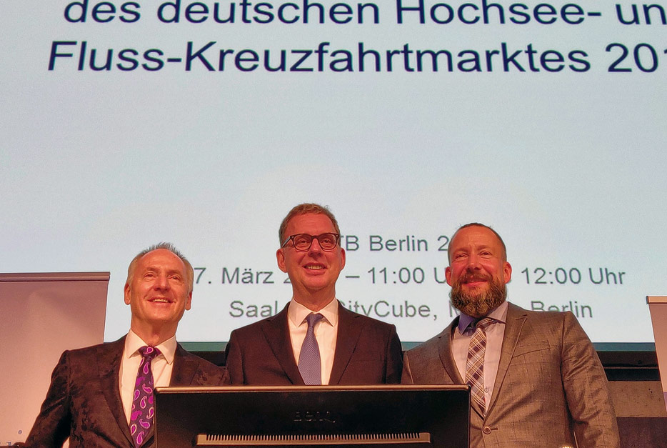 Alle Zahlen stammen aus Studien, die DRV, Clia und IG River Cruise gemeinsam auf der ITB in Berlin präsentiert haben, vertreten durch (im Bild von links) Karl J. Pojer, Chairman des Leadership Council der Clia, Norbert Fiebig, Präsident des Deutschen Reiseverbands (DRV), und Alexander Nothegger, Vize-Präsident der IG River Cruise.