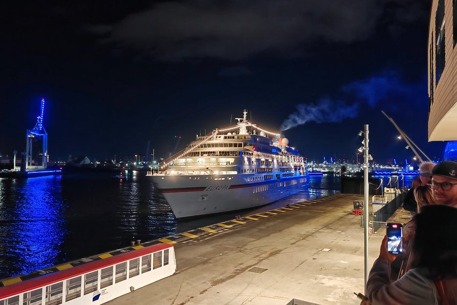 Als erstes Schiff an nun offiziell eröffneten Terminal legte am Freitagabend um etwa 22:30 Uhr die Europa dort ab. Der neue Kapitän der Europa, Tom Petzold, war während der Eröffnungszeremonie per Video zugeschaltet.