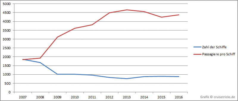 Eine Besonderheit der Grafik sei noch angemerkt: 2007 und 2008 weist die Statistik noch eine sehr hohe Zahl an Tagespassagieren, mutmaßlich also Fähren aus, die ab 2009 deutlich zurückgegangen sind. Das erklärt den deutlichen Abfall in diesem Jahren bei der Zahl der Schiffe.
