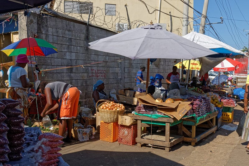 Dass wir ohne auszusteigen durch den turbulenten Straßenmarkt von Montego Bay nur mit dem Kleinbus durchfahren, ist durchaus angenehm.