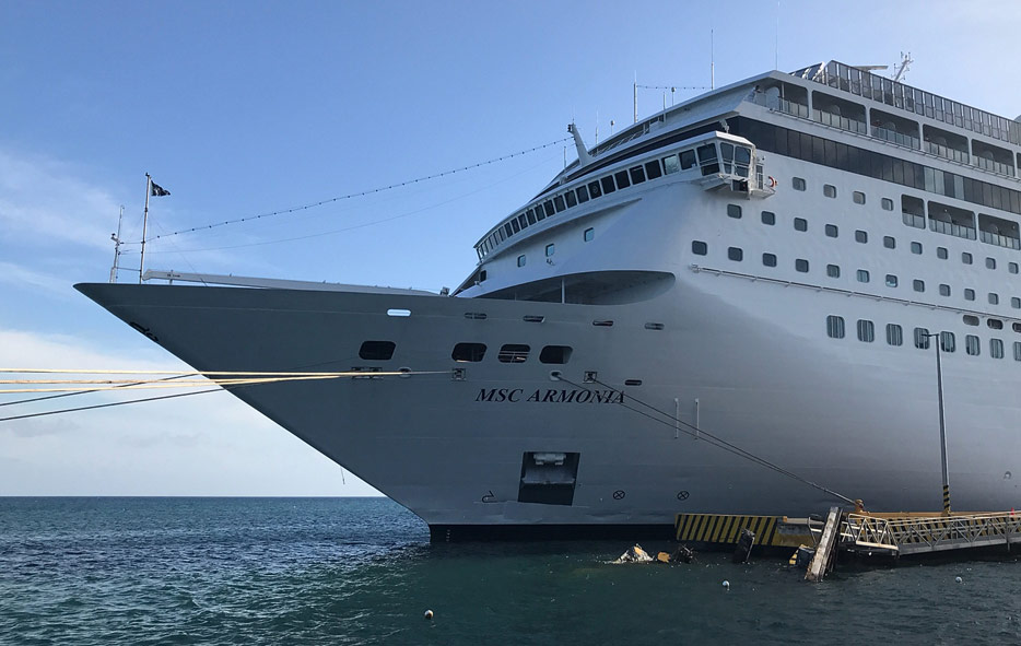 Die MSC Armonia hat den Ponton am Ende der Pier in Roatan in Honduras gerammt. Der Unfall ereignete sich am Dienstag, 10. April, vormittags Ortszeit. Der Ponton wurde bei dem Aufprall zerstört, das Kreuzfahrtschiff hat tiefe Schrammen im Bugbereich. Menschen wurden bei dem Unfall offenbar nicht verletzt.
