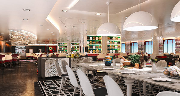 Der „Klassik“-Bereich wird laut TUI Cruises rund die Hälfte der Gesamtfläche des Atlantik belegen, „Mediterran“ und „Eurasia“ teilen sich die andere Hälfte. Jeden Abend haben die Passagiere hier also die Wahl zwischen verschiedenen Stilrichtungen. Quer-Bestellungen sollen allerdings nicht möglich sein, sodass beispielsweise im Eurasia-Teil des Atlantik keine mediterranen oder klassischen Gerichte bestellbar sein werden.