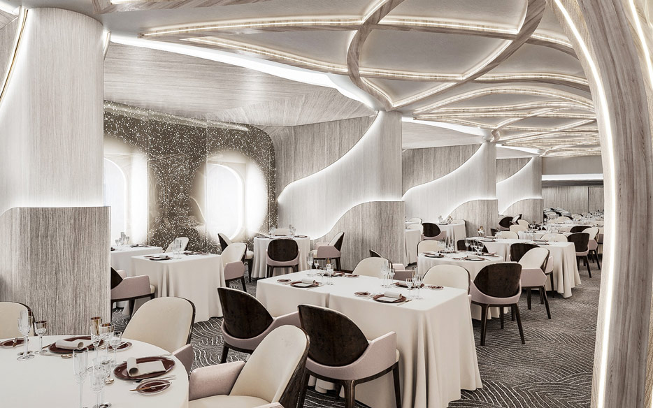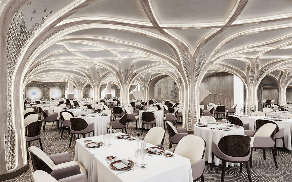 Im Restaurant will Regent seine Passagiere mit einem Baldachin aus verflochtenem Kristall und beleuchteten Bäumen begrüßen, die sich über deren Köpfe wölben und ihnen somit den Eindruck geben soll, in einem verwunschenen Wald zu speisen.