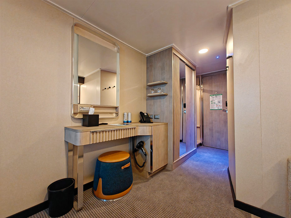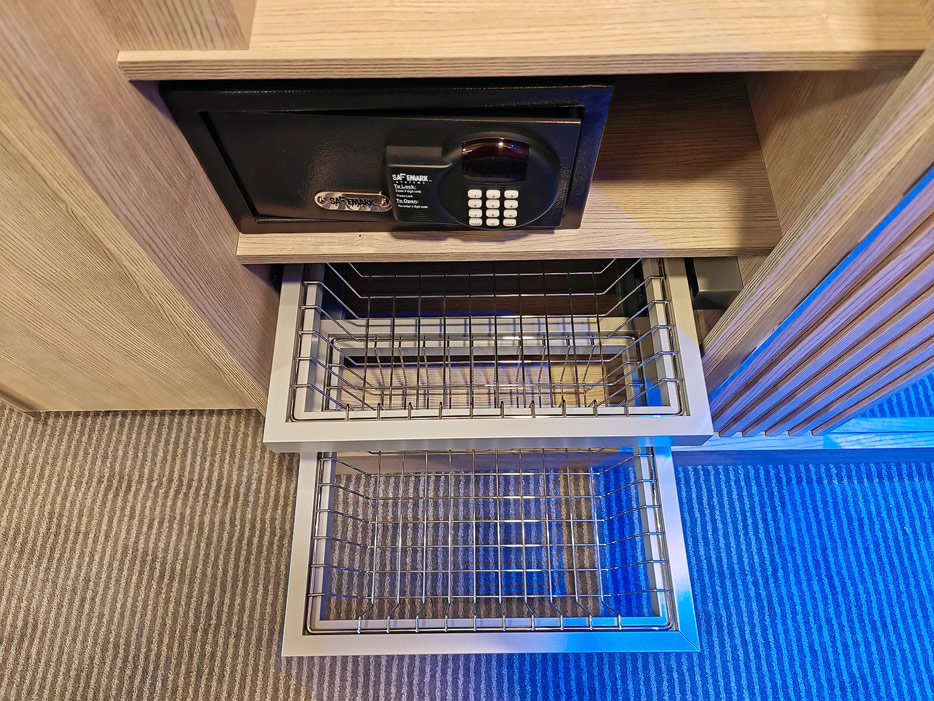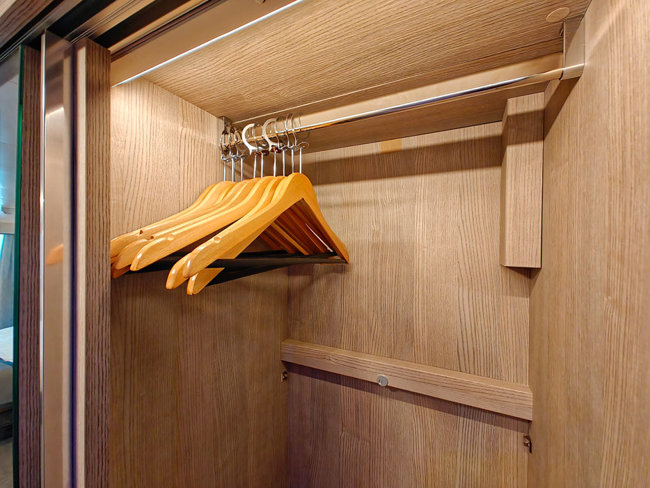 Leider gibt es in der Kabine recht wenig Stauraum und nahezu keinen Schubladenplatz. Anders als auf der Norwegian Prima gibt es jetzt aber einen hohen Hängebereich, sodass lange Kleider und Hosen unten nicht aufstehen.
