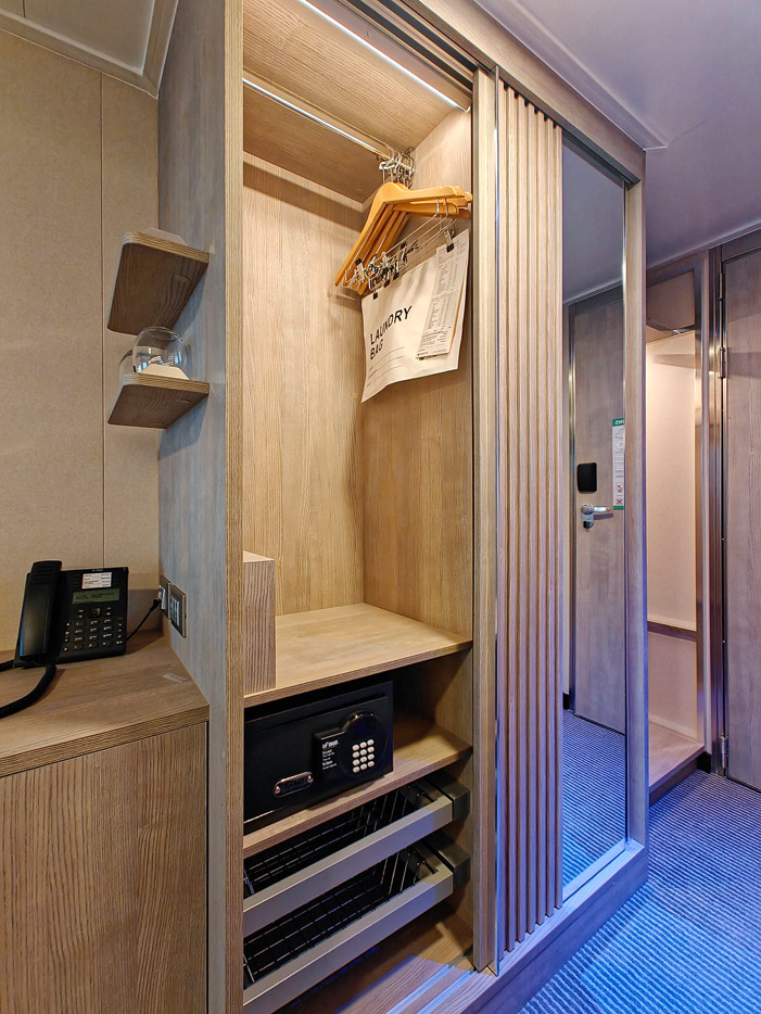 Ein Highlight für mich als jemand, der gerne bei absoluter Dunkelheit schläft: Der Vorhang zum Balkon ist weitgehend lichtdicht und es gibt nachts keinerlei störenden Lämpchen, nicht einmal ein Standby-Lämpchen am Fernseher. Ein blaues Nachtlicht über der Badezimmertür kann man vom Bett aus manuell ein- und ausschalten. Es geht also tatsächlich, was anderswo kaum anzutreffen ist – Kabinen zu bauen, in denen es nachts wirklich dunkel ist.