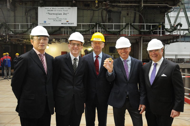 Auf der Papenburger Meyer Werft ist am Dienstag mit einer symbolischen Kiellegung der Bauprozess für die Norwegian Joy in Gang gesetzt worden.