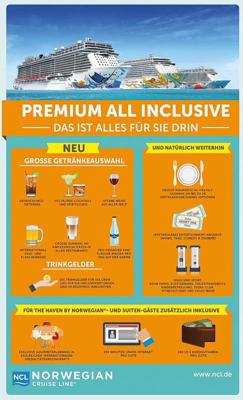 Norwegian Cruise Line reagiert mit der Umstellung auf „all inclusive“ nach eigener Aussage auf eine starke Nachfrage im deutschen Markt nach All-inclusive-Angeboten und der Kritik an der Trinkgeld-Politik internationaler Reedereien. Norwegian Cruise Line ist damit derzeit eine von nur ganz wenigen Reedereien im Volumen-Markt, die auf „all inclusive“ setzt.