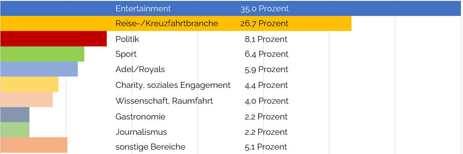 Fast eben so viele kommen auf dem engeren Umfeld der jeweiligen Reederei in der Reise- oder Kreuzfahrtbranche und aus den Werften. Aber auch Politikerinnen sind häufige Taufpatinnen, oft um symbolisch die enge Verbindung einer Reederei zu einem Land oder einem bestimmten Hafen zu demonstrieren.