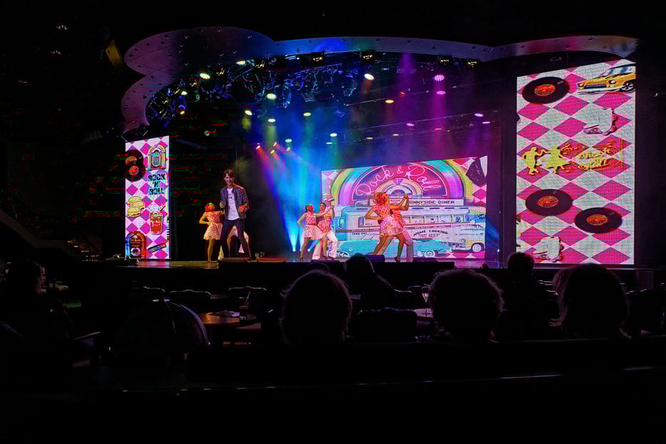 Das Show-Ensemble mit vier Sängern und sechs Tänzer wird bei manchen Shows durch eine sechsköpfige Live-Band ergänzt, was insgesamt in der Kreuzfahrt, besonders aber auf Schiffen dieser Größe inzwischen selten geworden ist. Die Qualität der Shows zu beurteilen, fällt nach einer Kurzreise mit nur eine Welcome-Show und der Queen-Show „We Will Rock You“ etwas schwer. Tänzer und Band scheinen erstklassig, die Sänger grundsätzlich sehr gut, wirken aber bei der Vielfalt der verlangten Stilrichtungen von Oper bis Rock nicht immer optimal besetzt. Aber dem Publikum hat es auf unserer Kurzreise gefallen und das ist es, was letztlich zählt.