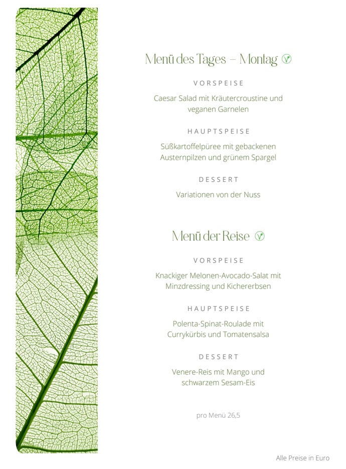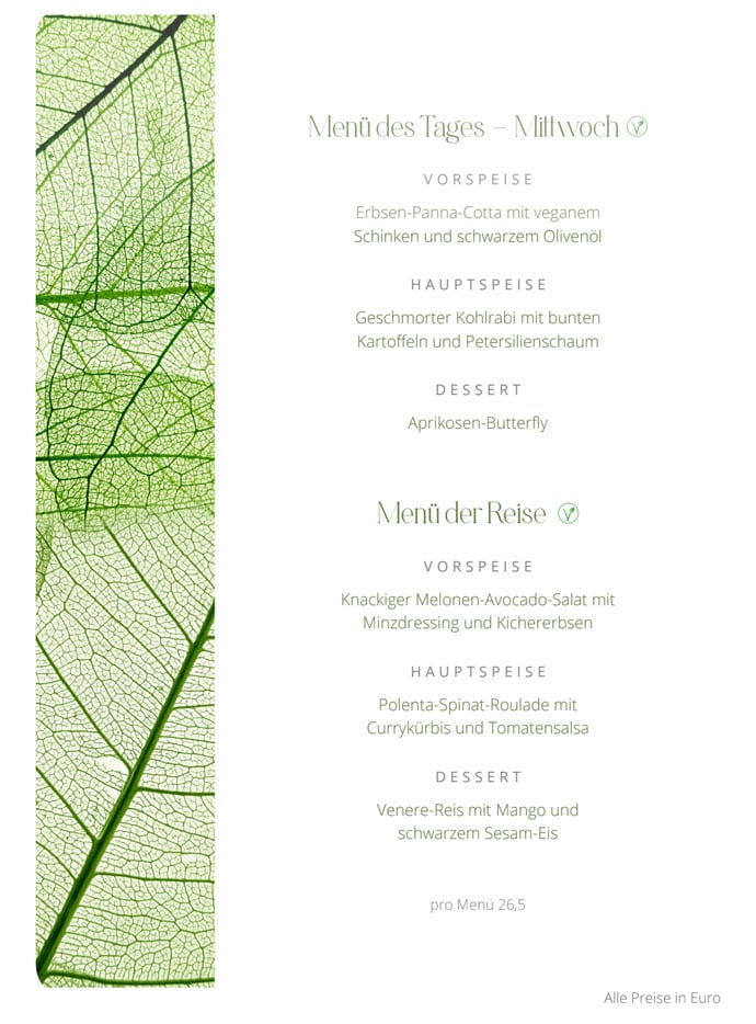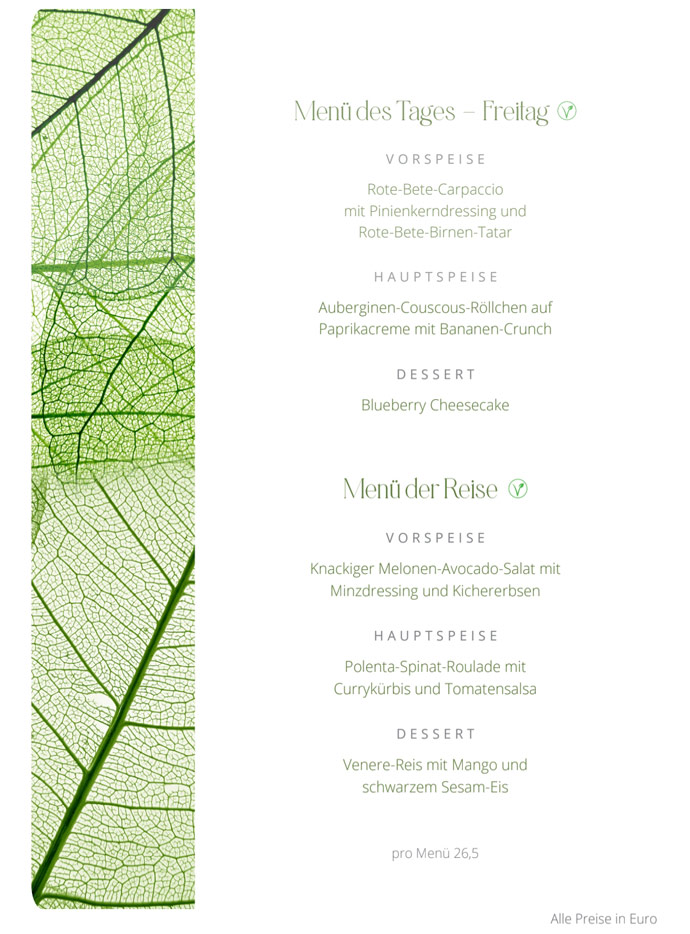 Veganes Essen gibt es bei AIDA übrigens nicht nur in dem veganen Restaurant. Vegane Optionen gibt es in eigentlich allen Restaurants, vom veganen Burger im „Best Burger @ Sea“ und einem veganen Steak im Buffalo Steakhaus beziehungsweise der Churrascaria, über das French Kiss und das Sushi House bis zu den Buffets, wo Veganes mit grünen Labels markiert ist. Auch im Edel-Restaurant Rossini hat Franz Schned neben dem normalen Menü eine komplett vegane Speisenfolge im Angebot.