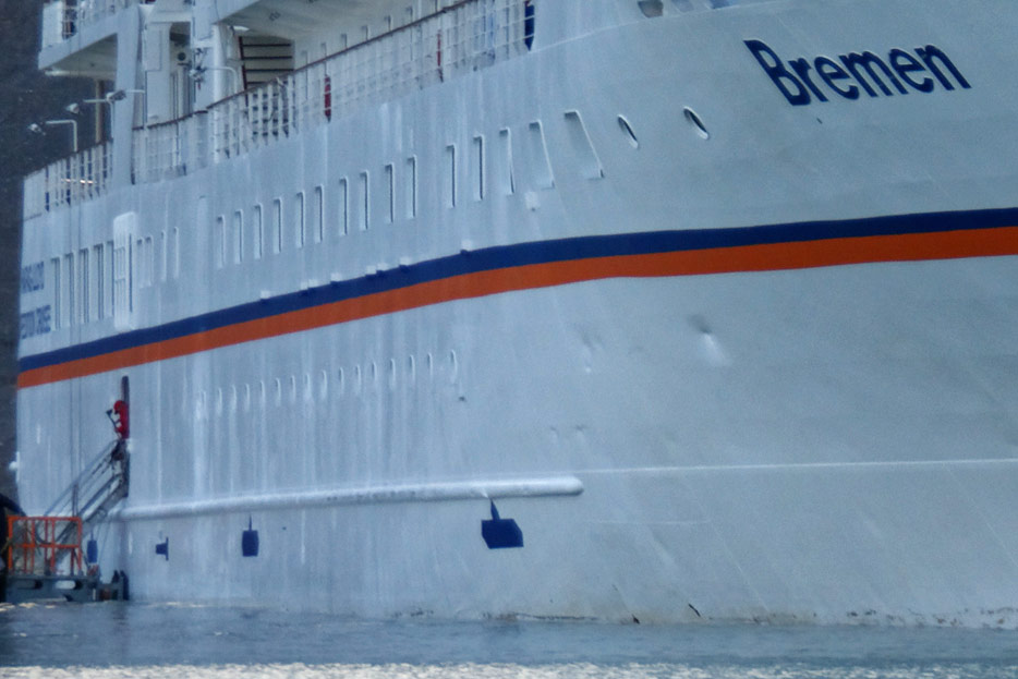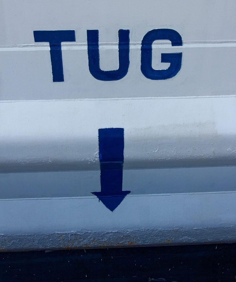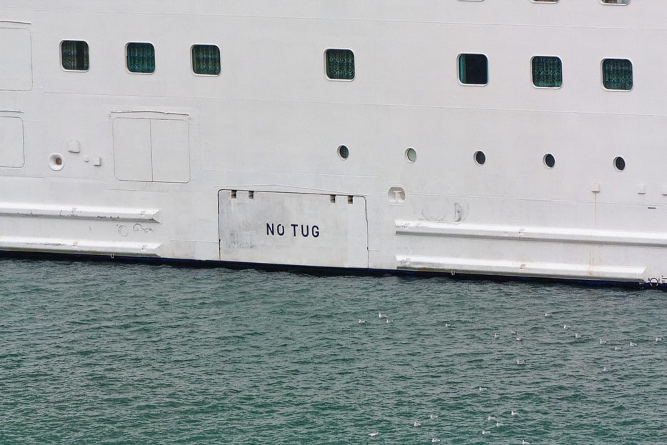 Besonders groß und deutlich sind seitlich an der Bordwand meist die Markierungen „Tug“ oder „No Tug“ erkennbar. Gelegentlich sind die Stellen fürs Anlegen von Schleppern auch als Symbol gekennzeichnet wie im Bild bei der Bremen.