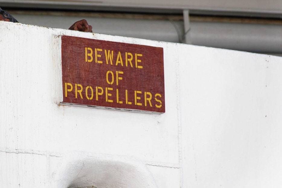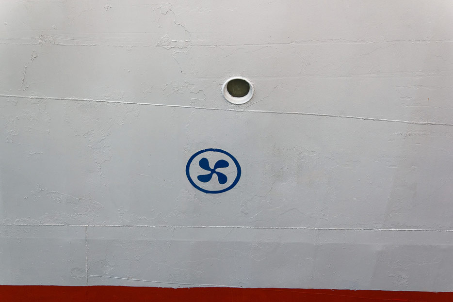 Diese Markierungen weisen auf die Gefahr von starken Wasserströmungen an diesen Stellen hin – Sog oder Schub, je nachdem, in welche Richtung sich die Propeller der Seitenstrahlruder drehen.