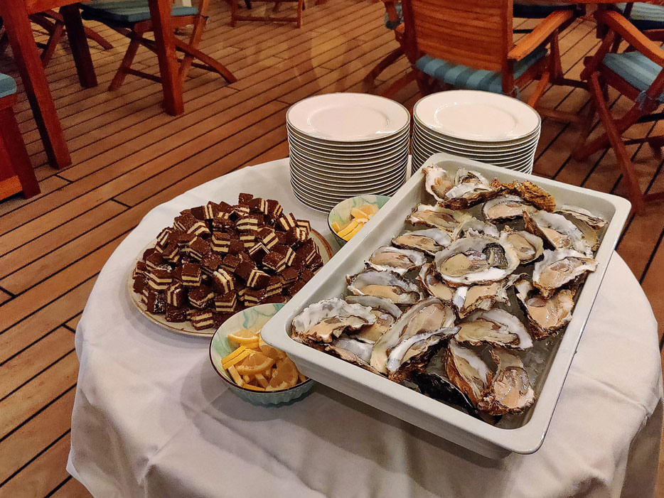 Zum anderen ist Sea Cloud Cruises recht großzügig: Die Flasche Champagner, die zur Begrüßung in der Kabine steht, darf – anders als auf großen Kreuzfahrtschiffen – gerne auch am Lido-Deck getrunken werden. Und bei den Empfängen zum Begrüßungscocktail, Gala-Abend und eventuell weiteren Empfängen gibt es großzügig Champagner gratis, auch schonmal 20 Minuten vor Beginn des eigentlichen Events. Und zur Cocktailstunde vor dem Dinner auch mal Austern und Kaviar.