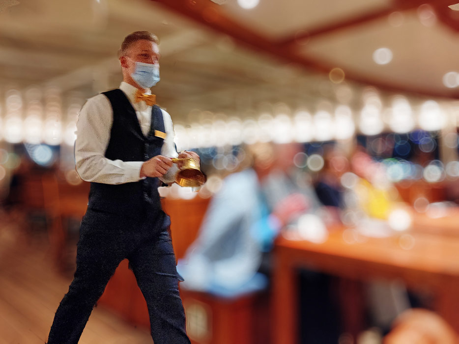 Die Sea Cloud Spirit fuhr auf dieser Reise zum ersten Mal mit einer so großen Passagierzahl (119 von 136 möglichen) sowie der regulären Besatzung von 85 Crewmitgliedern. Für eine so große Passagierzahl war die Crew jedoch noch nicht eingespielt. Das Serviceteam, das sei hier ausdrücklich betont, ist exzellent ausgebildet, liebeswert, aufmerksam, teils seit vielen Jahren dabei. Das konnte jedoch nicht ausgleichen, dass für die große Passagierzahl zu wenig Service-Crew verfügbar war – eine Schwäche, der sich nachjustieren lässt. Im Restaurant kam es daher oft zu längeren Wartezeiten sowie kleinere Unaufmerksamkeiten. Beispielsweise fehlten dann an manchen Tischen die Petit fours nach dem Dinner, Wein und Wasser wurde zu spät nachgeschenkt.