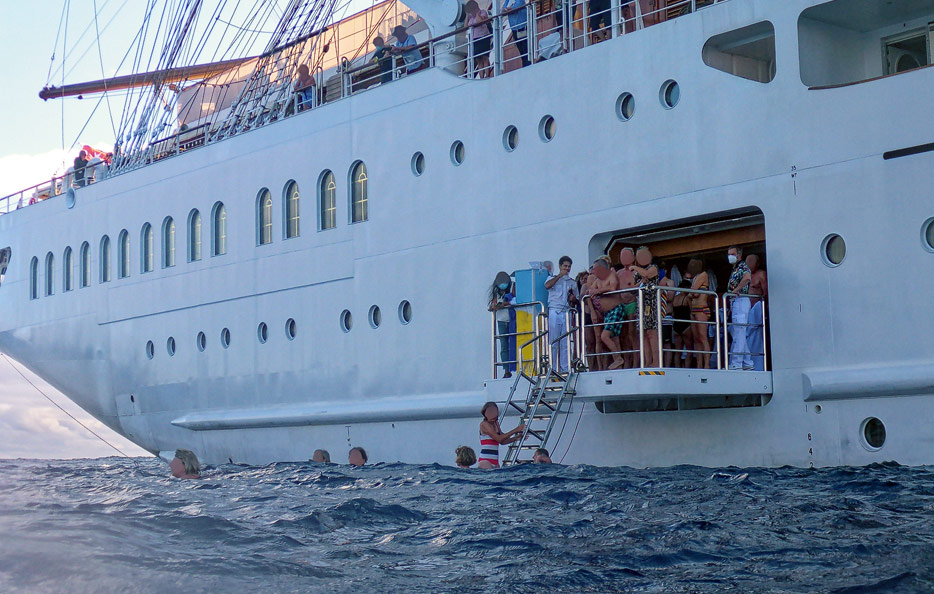 Statt Chlorwasser im übervölkerten Pool badet oder schwimmt man auf der Sea Cloud Spirit also im Meer. Das ist natürlich schwerer planbar. Wenn Wind und Wellen nicht mitspielen, ist das Vergnügen gegebenenfalls eher kurz oder muss auch mal ausfallen. Auf unserer Reise waren Wellen und Strömung letztlich die beiden Faktoren, die dem Badestopp ein rasches Ende setzten.