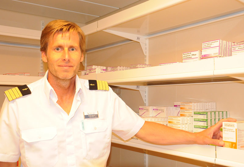 Osbahr arbeitet im Bordhospital mit einem weiteren Arzt und drei Krankenschwestern zusammen. Zudem gebe es eine spezielle Notfallgruppe, die aus Teilen der Crew bestehe. „Sie bringen Passagiere im Falle eines Falles mit einer Trage aus allen Bereichen des Schiffes ins Bordhospital und leisten eine Erstversorgung.“
